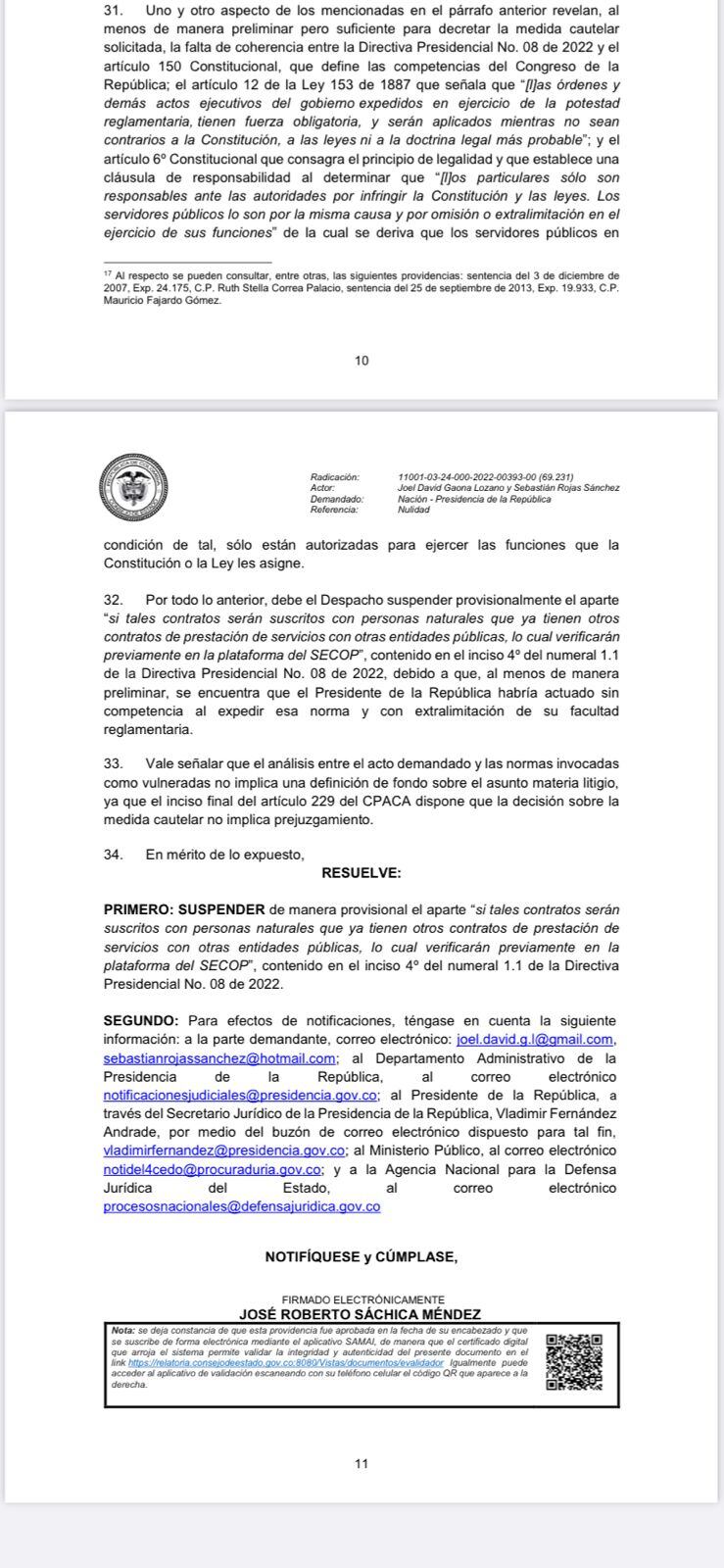 El Consejo de Estado suspendió la directriz que impedía tener dos contratos o más de prestación de servicios, luego de estudiar una demanda en contra de la directriz presidencial 08 de 2022 que establecía una serie de reglas para contratar con el Estado.