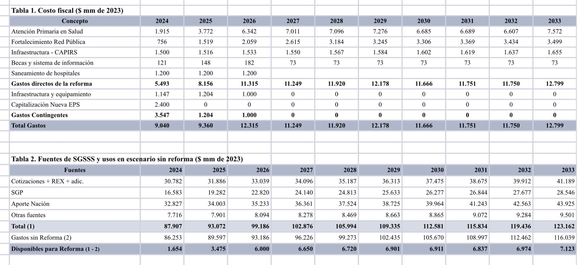 El siguiente cuadro muestra las cifras de costeo del Proyecto de Reforma a la Salud, que muestra que en 2024 y 2025 la reforma costaría alrededor 9 billones de pesos, de ahí en adelante costaría alrededor de 12 billones de pesos hasta 2033.