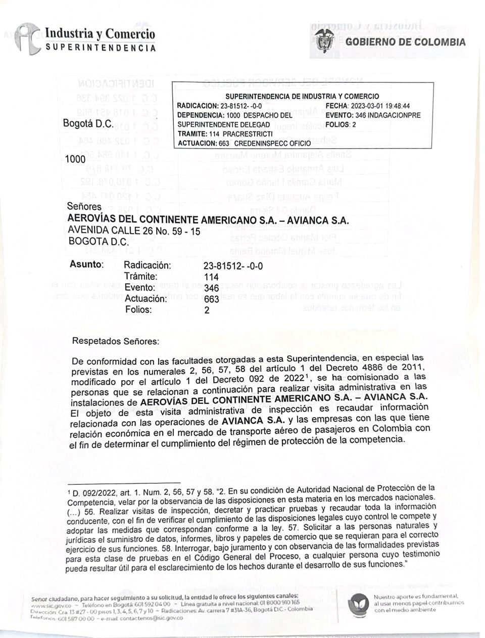“Recaudar información relacionada con las operaciones de AVIANCA S.A. y las empresas con las que tiene relación económica en el mercado de transporte aéreo de pasajeros en Colombia con el fin de determinar el cumplimiento del régimen de protección de la competencia”, señala el documento enviado a una de las aerolíneas.