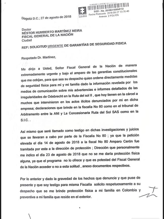 En una carta del 27 de agosto de 2018, el ‘controller’ de Odebrecht le pidió al exfiscal Néstor Humberto Martínez, que garantizara su seguridad al ser testigo del escándalo de corrupción de la multinacional brasilera