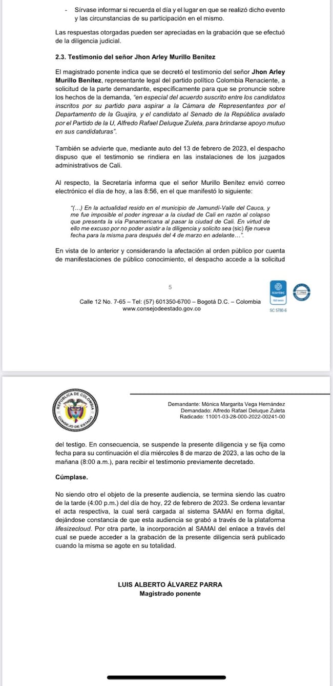 Y el magistrado ponente indica que se decretó el testimonio del señor Jhon Arley Murillo Benítez, representante legal del partido político Colombia Renaciente, a solicitud de la parte demandante, específicamente para que se pronuncie sobre los hechos de la demanda, “en especial del acuerdo suscrito entre los candidatos inscritos por su partido para aspirar a la Cámara de Representantes por el Departamento de la Guajira, y el candidato al Senado de la República avalado por el Partido de la U, Alfredo Rafael Deluque Zuleta, para brindarse apoyo mutuo en sus candidaturas”
