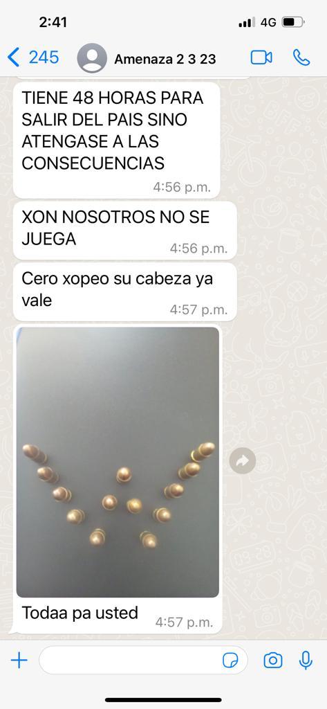 Las amenazas fueron enviadas vía whatsapp a su celular personal y en estas le piden que salga del país en las próximas 48 horas.