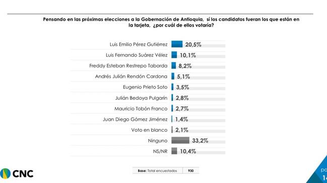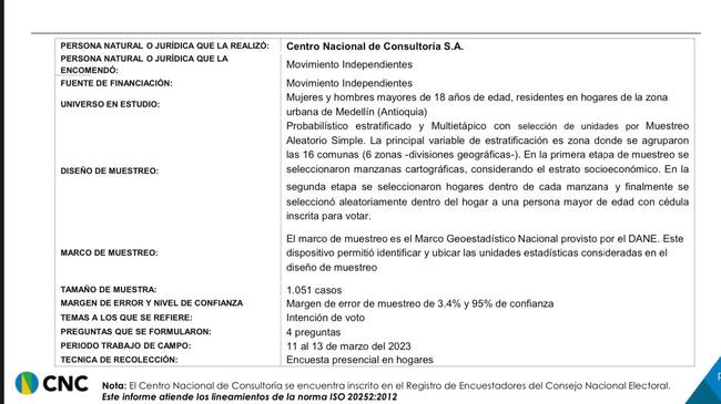 Uno de los temas que conversaron tiene que ver con la encuesta contratada por Independientes. Esta encuesta la hace el Centro Nacional de Consultoría. La muestra fue de 1.051 encuestas presenciales hechas entre el 11 y el 13 de marzo. La encuesta la puntea Luis Perez, con 20,5%. Le siguen Luis Fernando Suárez, con 10,1%; Esteban Restrepo, de independientes, con 8,2%, y más abajo, en el sexto lugar, está Julián Bedoya, con el 2,8%.