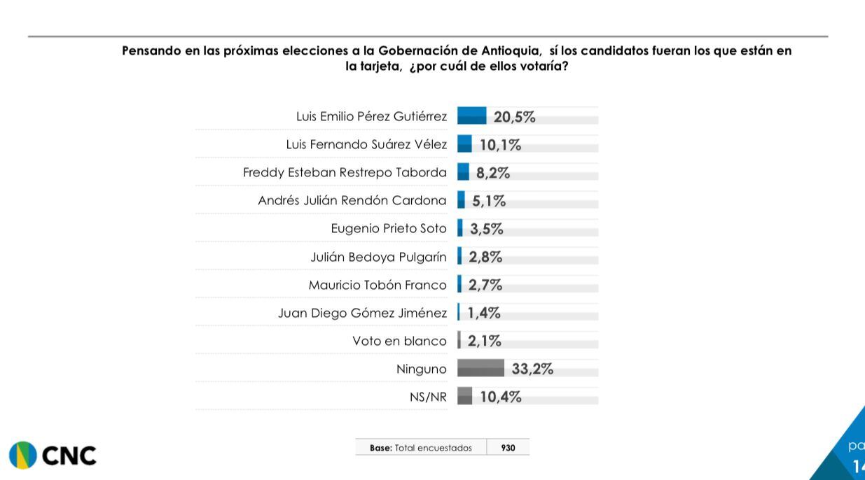 Uno de los temas que conversaron tiene que ver con la encuesta contratada por Independientes. Esta encuesta la hace el Centro Nacional de Consultoría. La muestra fue de 1.051 encuestas presenciales hechas entre el 11 y el 13 de marzo. La encuesta la puntea Luis Perez, con 20,5%. Le siguen Luis Fernando Suárez, con 10,1%; Esteban Restrepo, de independientes, con 8,2%, y más abajo, en el sexto lugar, está Julián Bedoya, con el 2,8%.