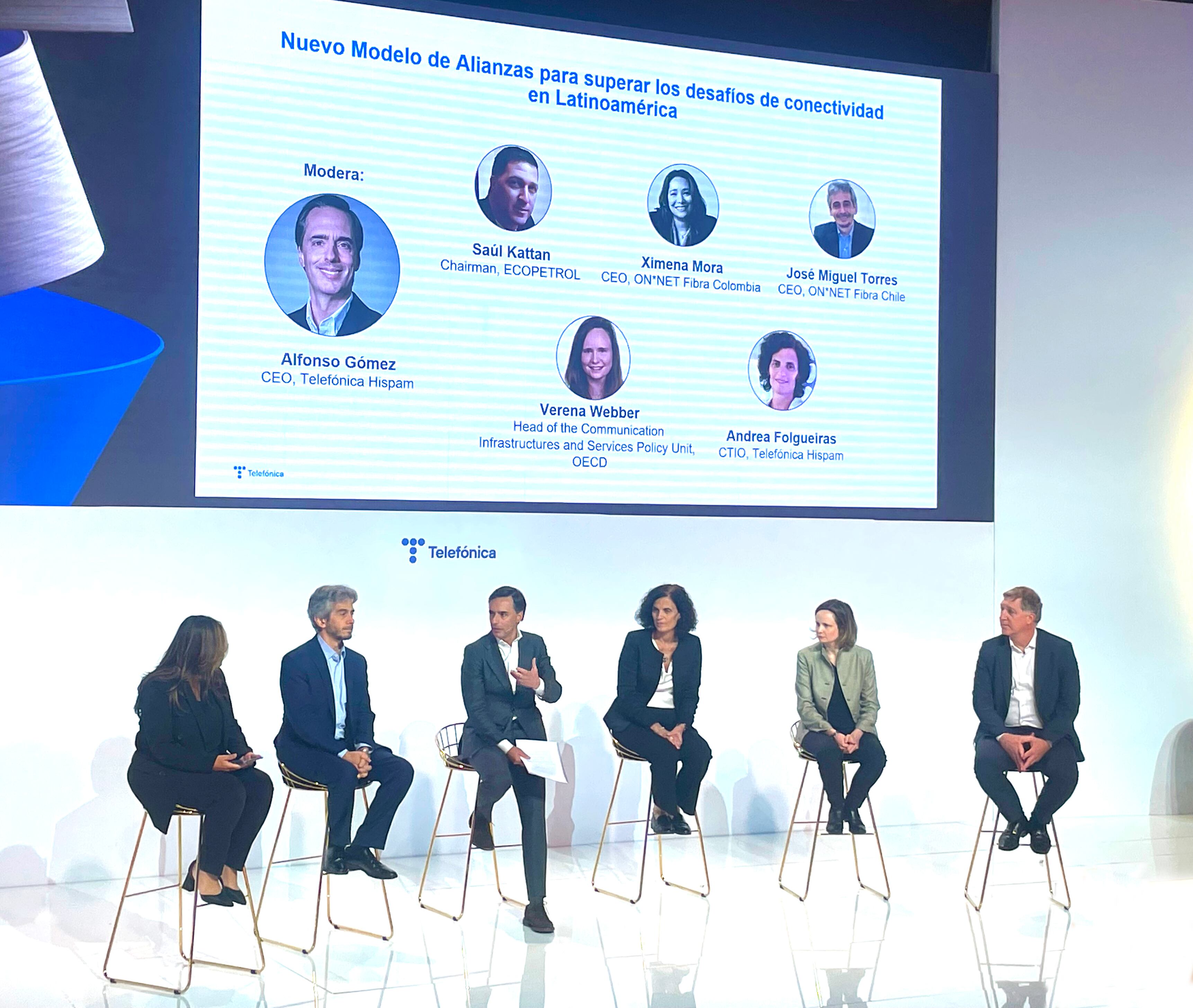Durante el panel ‘Nuevo Modelo de Alianzas para superar los desafíos de conectividad en Latinoamérica’, José Miguel Torres, CEO de ON*NET Fibra Chile; Ximena Mora Méndez, CEO de ON*NET Fibra Colombia; Verena Weber, Head of Communication Infrastructures and Services Policy Unit de la OECD; Saúl Kattan, Consejero de la Presidencia en Colombia y Presidente de ECOPETROL; junto a Alfonso Gómez Palacio, CEO de Telefónica Hispam, Andrea Folgueiras, CTIO de Telefónica Hispam y José Juan Haro, Director de Negocio Mayorista y Asuntos Públicos de Telefónica Hispam, destacaron los retos que la región tiene en términos de conectividad. Además, resaltaron la importancia de contar con políticas públicas adecuadas para replicar esquemas de compartición de infraestructura que faciliten el camino de nuevos modelos de negocio para avanzar de forma rápida y efectiva en el cierre de la brecha digital en la región, y con ello impulsar el desarrollo de habilidades y capacidades digitales en la población para aprovechar los beneficios del acceso a internet y la tecnología.