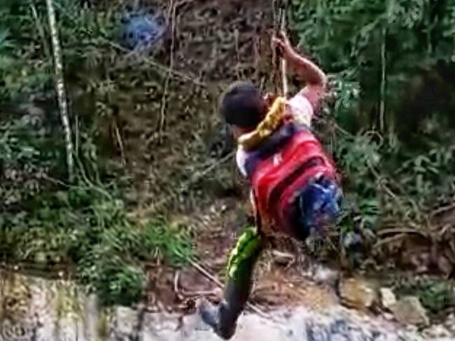 Los menores de la vereda Los Guayabales, del corregimiento de Playa Rica, jurisdicción del municipio de El Tambo, Cauca, arriesgan su vida al atravesar el caudaloso río Mechengue a una altura de 10 metros para llegar hasta las aulas de la institución educativa.