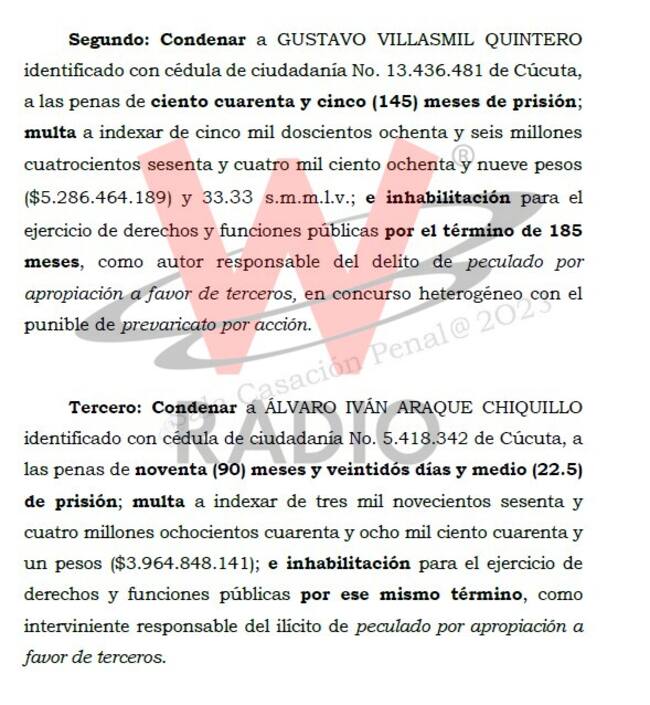 La Corte Suprema de Justicia a través de la sala de casación penal, resolvió condenar a Gustavo Villasmil Quintero, exalcalde encargado de Cúcuta entre los años 2004 y 2005 como autor responsable del delito de peculado por apropiación a favor de terceros, en concurso heterogéneo con el punible de prevaricato por acción y al abogado Álvaro Iván Araque Chiquillo como interviniente responsable del ilícito de peculado por apropiación a favor de terceros.
