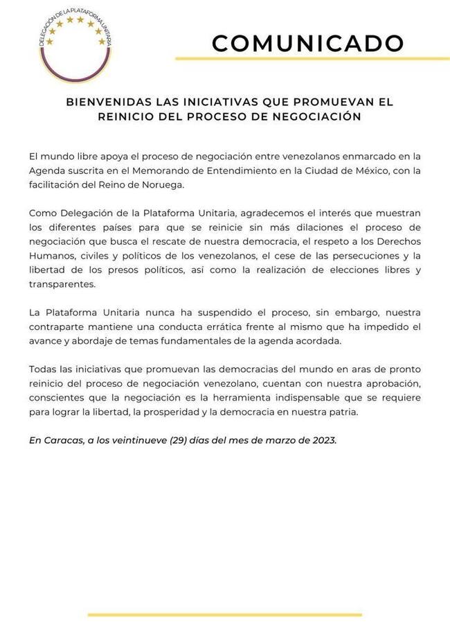 “Como Delegación de la Plataforma Unitaria, agradecemos el interés que muestran los diferentes países para que se reinicie sin más dilaciones el proceso de negociación que busca el rescate de nuestra democracia”, se lee en el documento en el que también recuerdan que no han sido ellos los que se han levantado de la mesa en México.