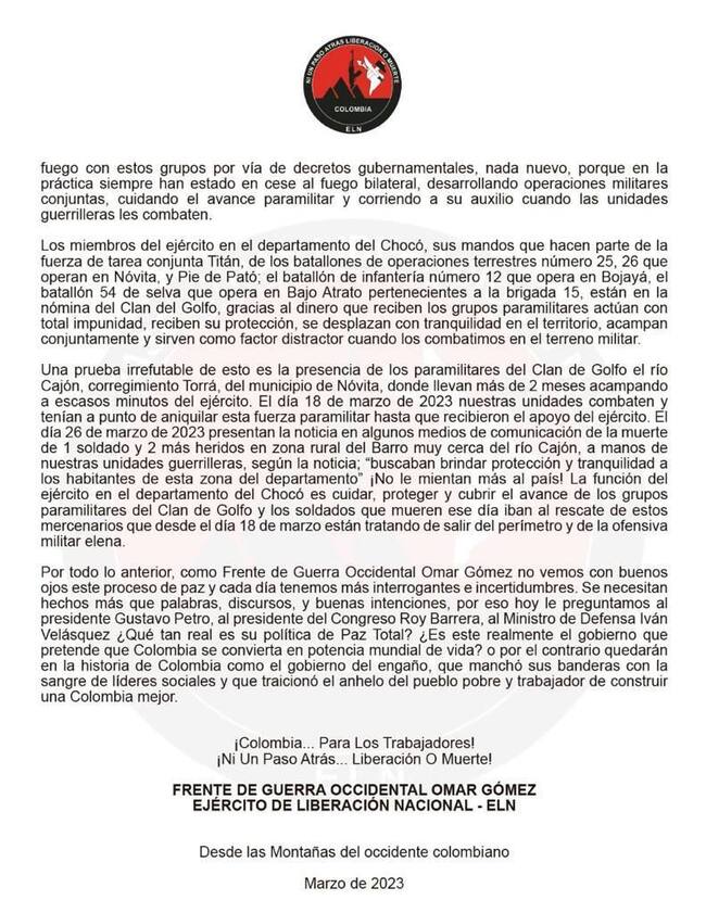 “Por todo lo anterior, como Frente de Guerra Occidental Omar Gómez no vemos con buenos ojos este proceso de paz y cada día tenemos más interrogantes e incertidumbres. Se necesitan hechos más que palabras, discursos, y buenas intenciones, por eso hoy le preguntamos al presidente Gustavo Petro, al presidente del Congreso Roy Barrera, al ministro de Defensa Iván Velásquez ¿Qué tan real es su política de Paz Total? ¿Es este realmente el gobierno que pretende que Colombia se convierta en potencia mundial de vida? o por el contrario quedarán en la historia de Colombia como el gobierno del engaño, que manchó sus banderas con la sangre de líderes sociales y que traicionó el anhelo del pueblo pobre y trabajador de construir una Colombia mejor”, sentencian