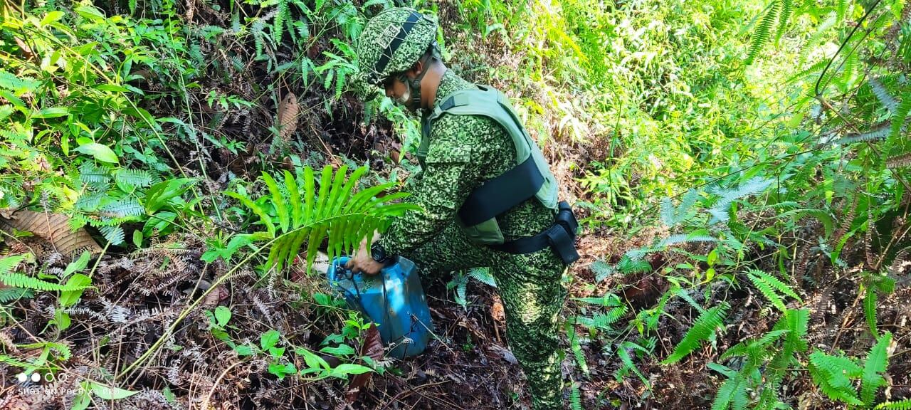 La primera operación se desarrolló en el corregimiento 8, en donde tropas del Batallón Fluvial de Infantería de Marina No. 24 ubicaron un depósito ilegal con cuatro canecas plásticas. Estas contenían en su interior 120 kilogramos de explosivos tipo ANFO, de fabricación industrial.