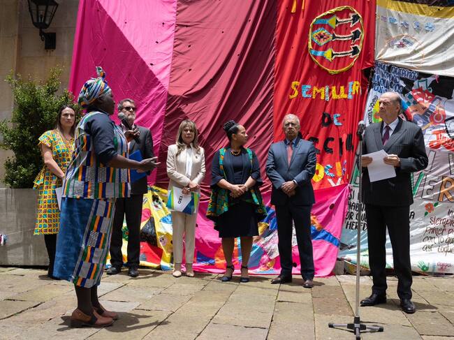 Desde este lunes 10 de abril y hasta el próximo 14 de abril la fachada de la Cancillería tendrá telas cuyos bordados cuentan historias que buscan promover la paz, la memoria, la reconciliación y la no repetición.