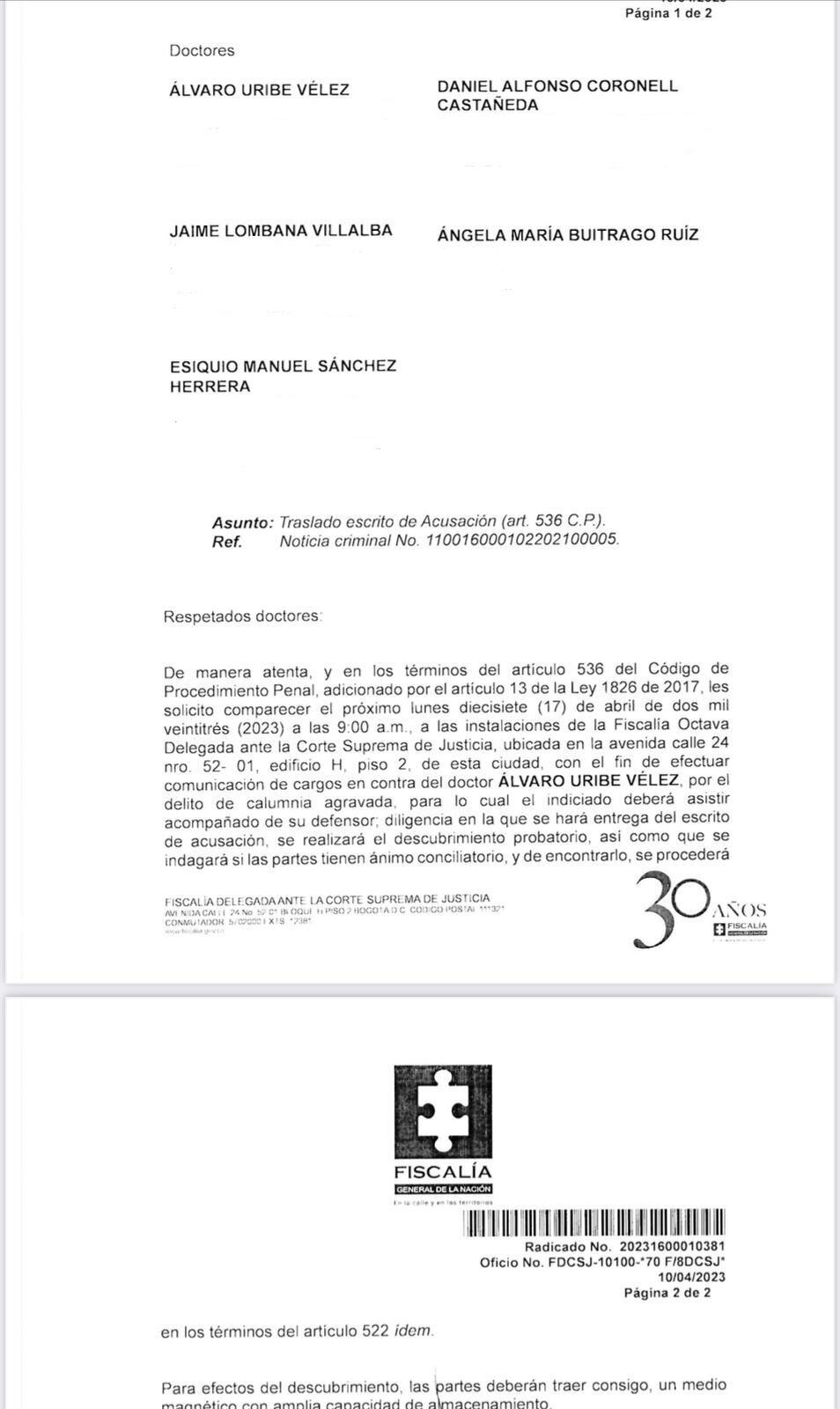 “Con el fin de efectuar comunicación de cargos en contra del doctor Álvaro Uribe Vélez, por el delito de calumnia agravada, para lo cual el indiciado deberá asistir acompañado de su defensor; diligencia en la que se hará entrega del escrito de acusación, se realizará el descubrimiento probatorio, asi como que se indagara si las partes tienen ánimo conciliatorio, y de encontrarlo, se procederá”, señala la comunicación de la Fiscalía.