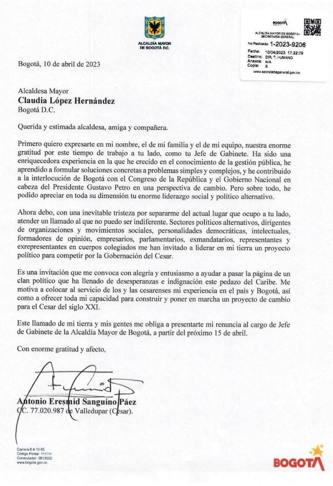 Como lo anticipó la W, el Jefe de Gabinete de la Alcaldía de Bogotá, Antonio Sanguino, presentó su renuncia al cargo este 10 de abril, en una carta dirigida a la alcaldesa Claudia López. En la carta, Sanguino expresó su agradecimiento por la oportunidad de trabajar con la alcaldesa y su equipo, así como por la experiencia y el conocimiento adquiridos durante su tiempo en el cargo.
