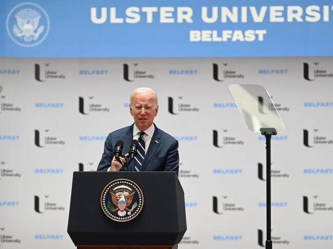 BELFAST, NORTHERN IRELAND - APRIL 12: President Joe Biden is pictured at Ulster University on April 12, 2023 in Belfast, Northern Ireland. US President Joe Biden spends the day in Belfast meeting with UK Prime Minister Rishi Sunak and delivering a speech at Ulster University. His visit marks the 25th anniversary of the Good Friday Agreement, the peace deal which ended 30 years of conflict in Northern Ireland. (Photo by Charles McQuillan/Getty Images) / Charles McQuillan