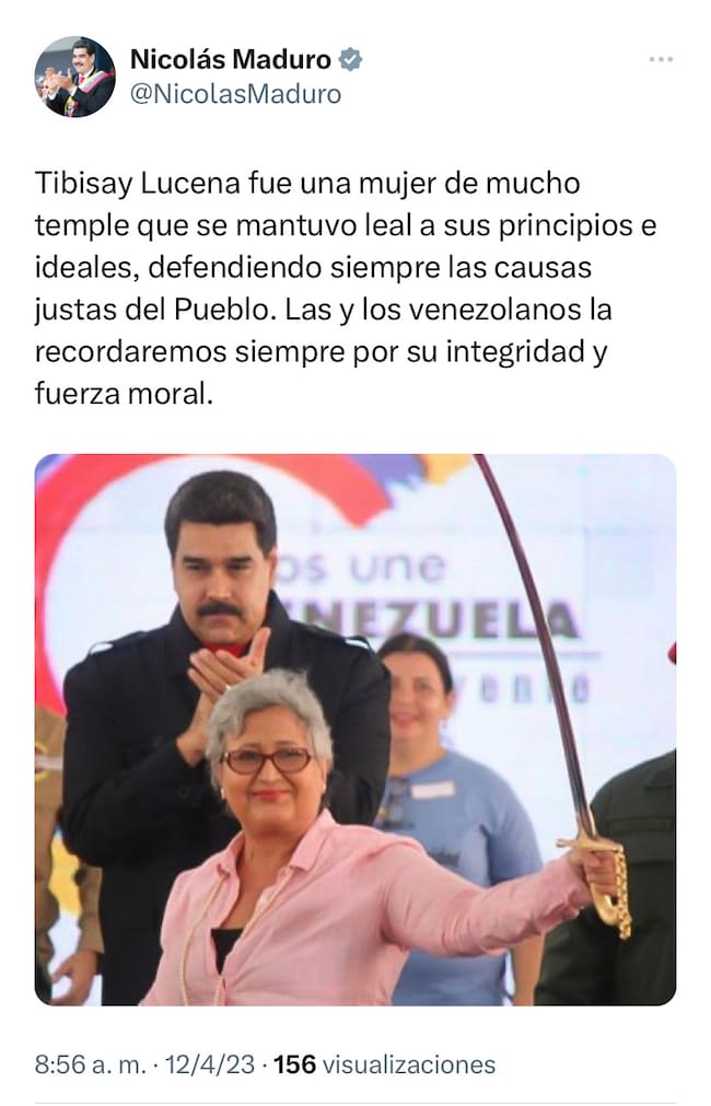 - “Ha cambiado de paisaje Tibisay Lucena. Hija insigne de Venezuela, ex Pdta del Poder Electoral y Ministra de Educación Universitaria. Fue una verdadera militante por la vida, y libró su última batalla sin tregua. Nuestras condolencias a sus familiares y amigos.Vuela alto hermana! (sic)”.