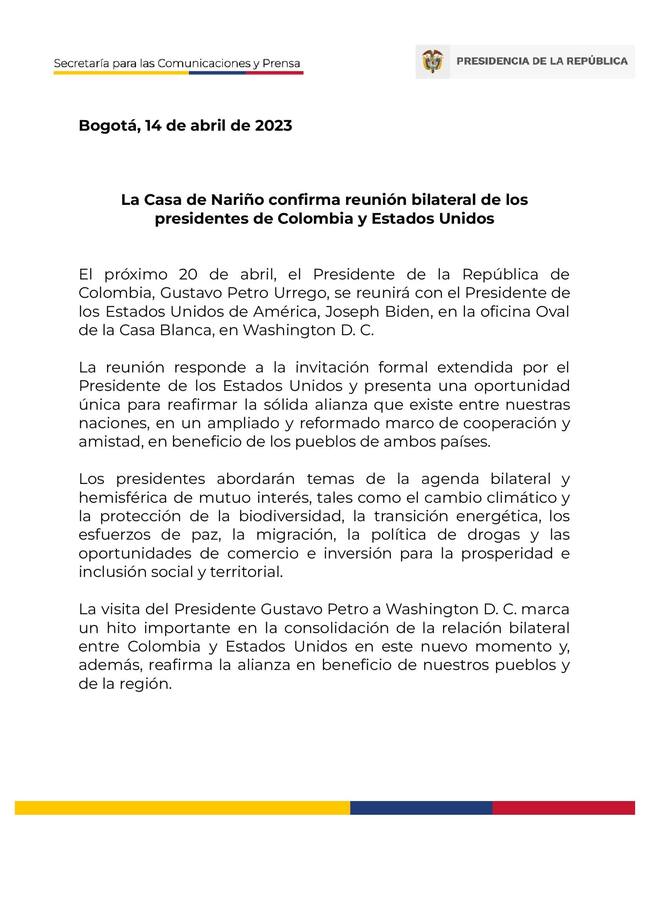 En ese sentido, y como lo confirmó el presidente Petro, se abordarán temas de “la agenda bilateral y hemisférica de mutuo interés, tales como el cambio climático y la protección de la biodiversidad, la transición energética, los esfuerzos de paz, la migración, la política de drogas y las oportunidades de comercio e inversión para la prosperidad e inclusión social y territorial”.