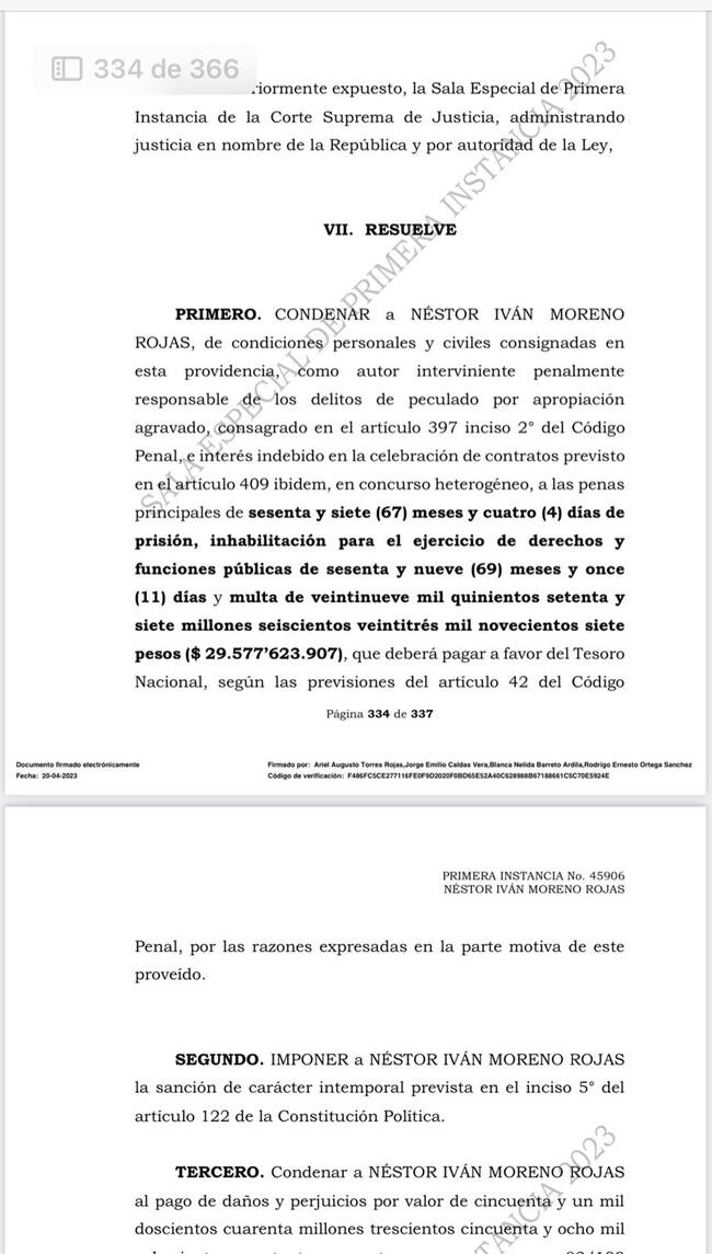La nueva condena en contra de Iván Moreno fue impuesta por la Sala de Primera Instancia del alto tribunal por los delitos de peculado por apropiación e interés indebido en la celebración de contratos: “como autor interviniente penalmente responsable de los delitos de peculado por apropiación agravado, consagrado en el artículo 397 inciso 2º del Código Penal, e interés indebido en la celebración de contratos”, dice la Corte.
