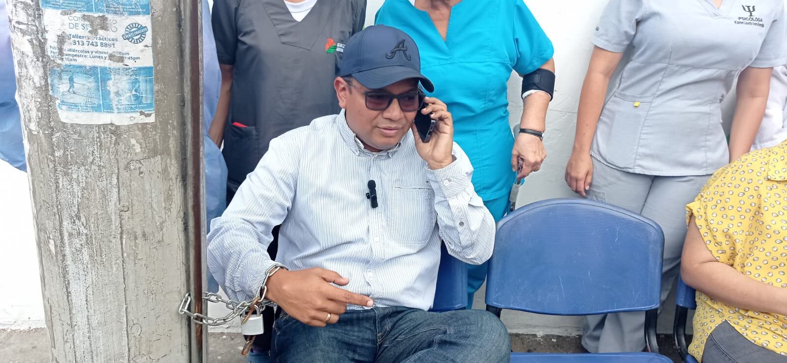 Desde muy temprano el gerente de la Clínica Girón, Aymer Alvarado se encadenó a las afueras de las institución médica como protesta pues dice que le quieren terminar su contrato antes de tiempo para que en su puesto llegue una persona de confianza de la alcaldesa Yulia Rodríguez.