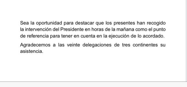 El documento final, leído por el canciller Alvaro Leyva, “que recoge las discusiones que tuvieron lugar en la Conferencia Internacional”, consta de tres puntos que, según se lee, surgen de la “identificación de posiciones comunes”: