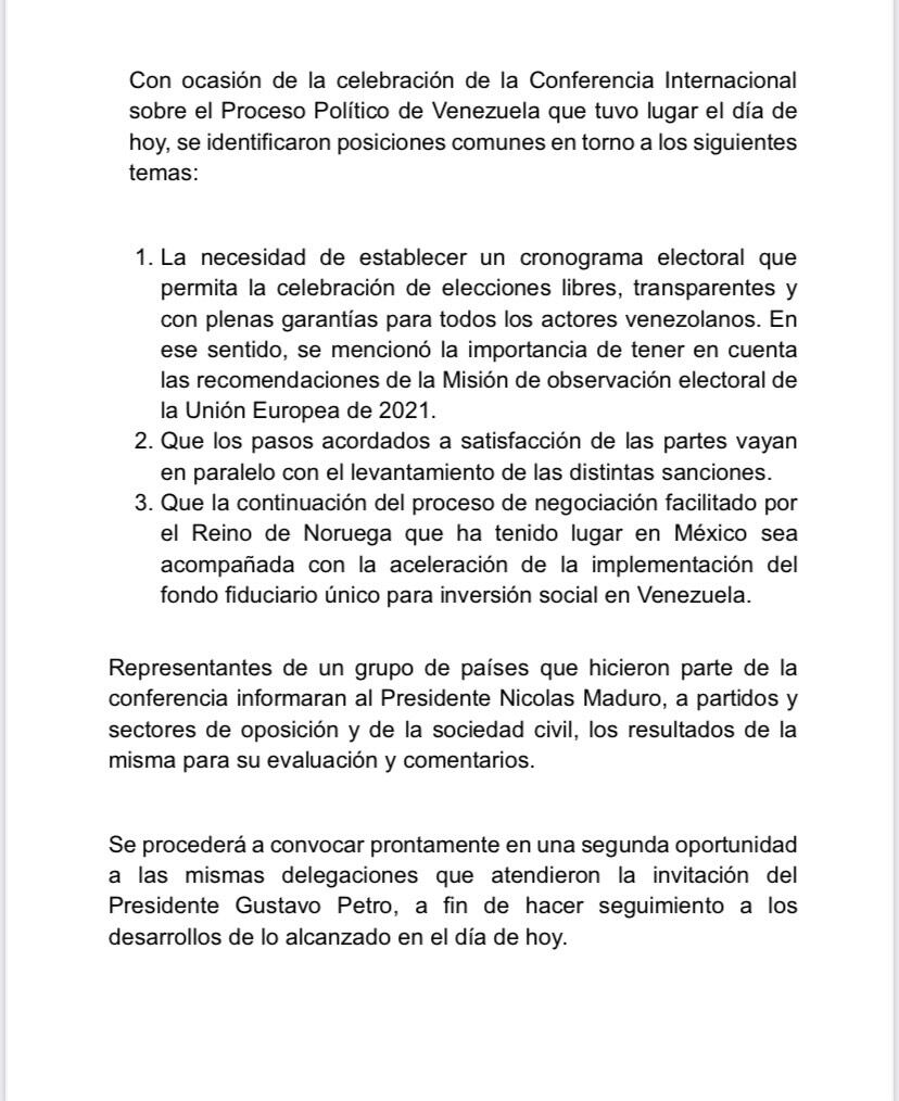 El documento final, leído por el canciller Alvaro Leyva, “que recoge las discusiones que tuvieron lugar en la Conferencia Internacional”, consta de tres puntos que, según se lee, surgen de la “identificación de posiciones comunes”: