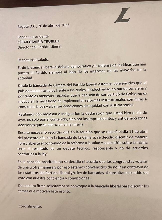 18 de 33 representantes liberales envíaron una carta al expresidente César Gaviria por sus advertencias sobre la reforma a la salud