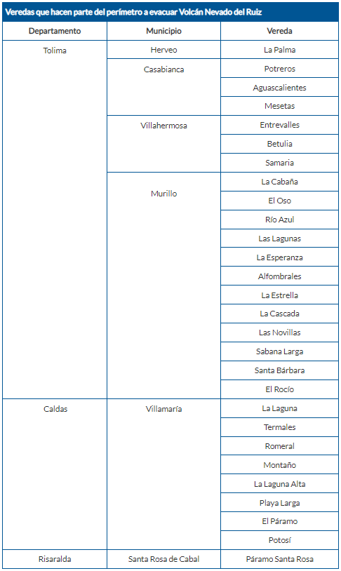 Por ese motivo, la UNGRD verificó con las entidades del SNGRD y las autoridades municipales que algunos sectores de 19 veredas que se encuentran dentro del perímetro y se deben evacuar de manera preventiva, de acuerdo con el mapa aportado por el Servicio Geológico Colombiano (SGC).