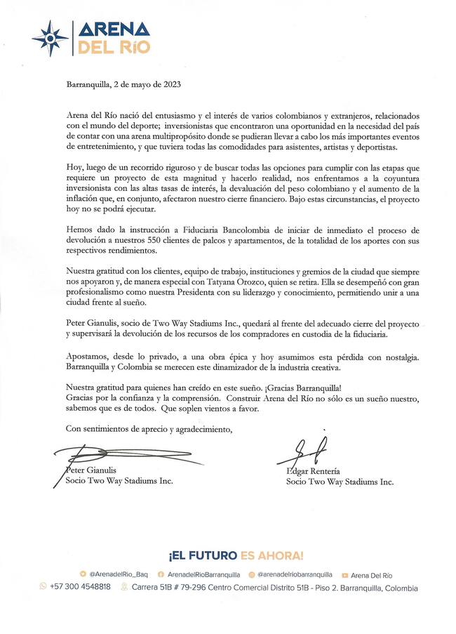 A través de un comunicado a la opinión pública, firmado por Peter Gianulis y Edgar Rentería, socios de la firma Two Way Stadiums, dieron a conocer que el Megaproyecto Arena del Río no se ejecutará.