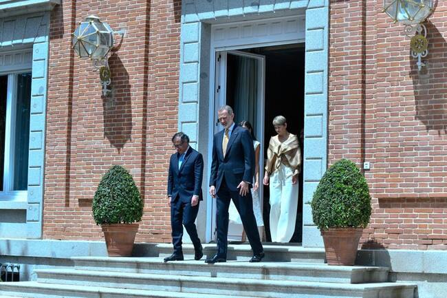 Tras la reunión, los reyes, Petro y su esposa salieron juntos a los jardines de la Zarzuela para posar ante los medios gráficos antes del almuerzo.
