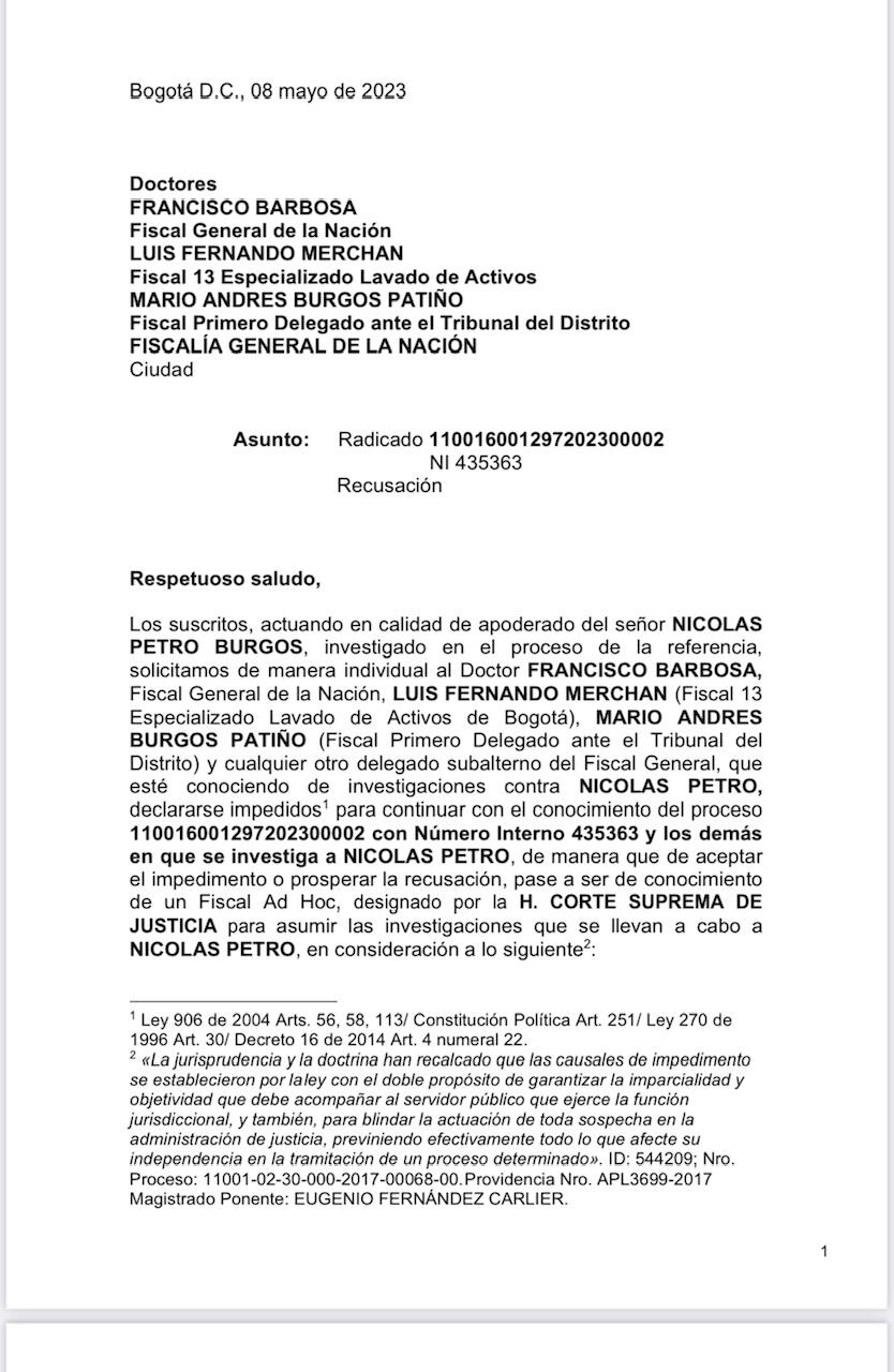 La defensa del diputado Nicolás Petro, hijo del presidente Gustavo Petro, recusó al fiscal general Francisco Barbosa y en el mismo documento, pidió el cambio de los fiscales que actualmente tienen a su cargo la investigación por presunto lavado de activos.