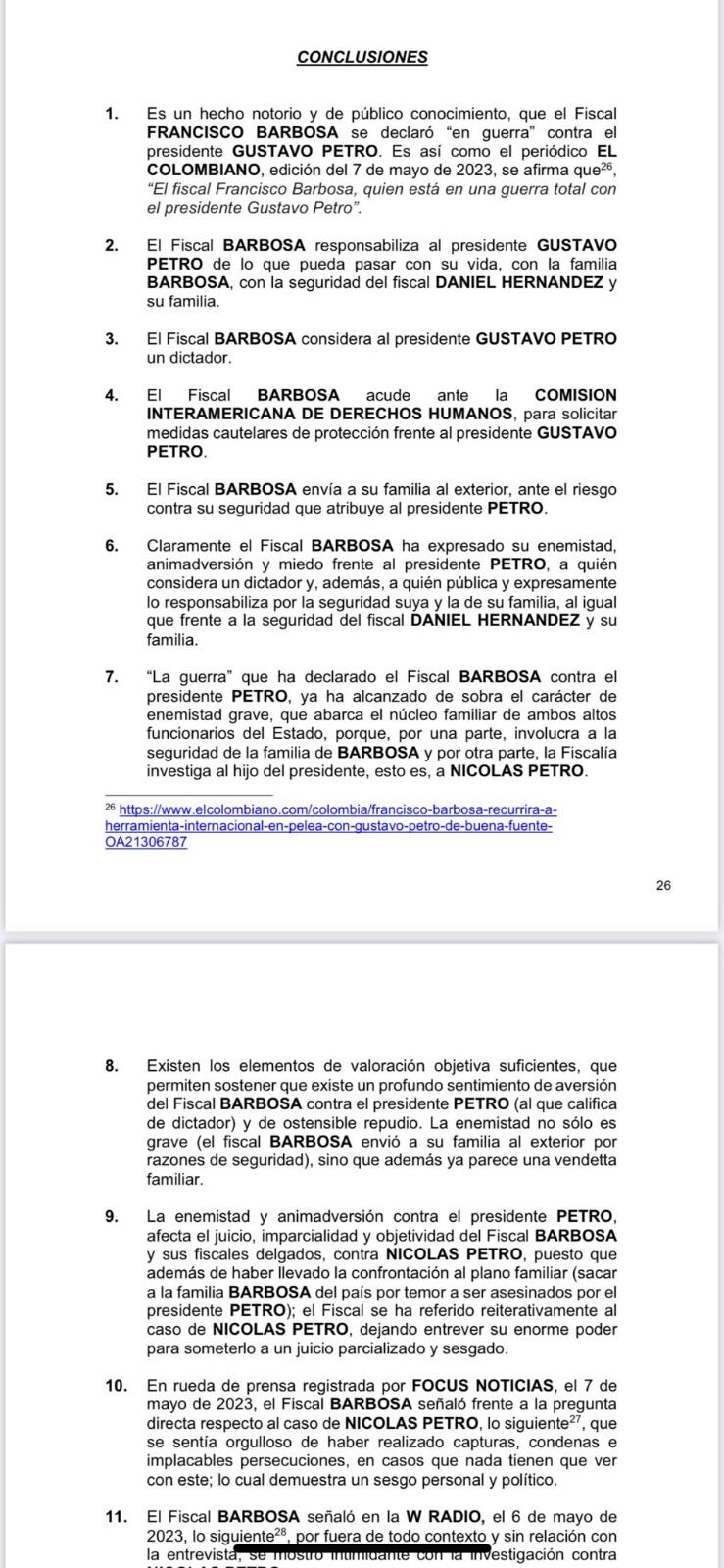 También señalaron que “La guerra que ha declarado el Fiscal BARBOSA contra el presidente PETRO, ya ha alcanzado de sobra el carácter de enemistad grave, que abarca el núcleo familiar de ambos altos funcionarios del Estado, porque, por una parte, involucra a la seguridad de la familia de BARBOSA y por otra parte, la Fiscalía investiga al hijo del presidente, esto es, a NICOLAS PETRO”.