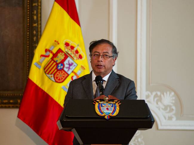 Colombian president Gustavo Petro speaks during the official visit of Pedro Sanchez, government president of Spain to Colombia, in Bogota, Colombia on August 24, 2022. Sanchez offered Spain as a negotiation country for the peace process with the ELN Guerrilla. (Photo by Sebastian Barros/NurPhoto via Getty Images) / Sebastian Barros
