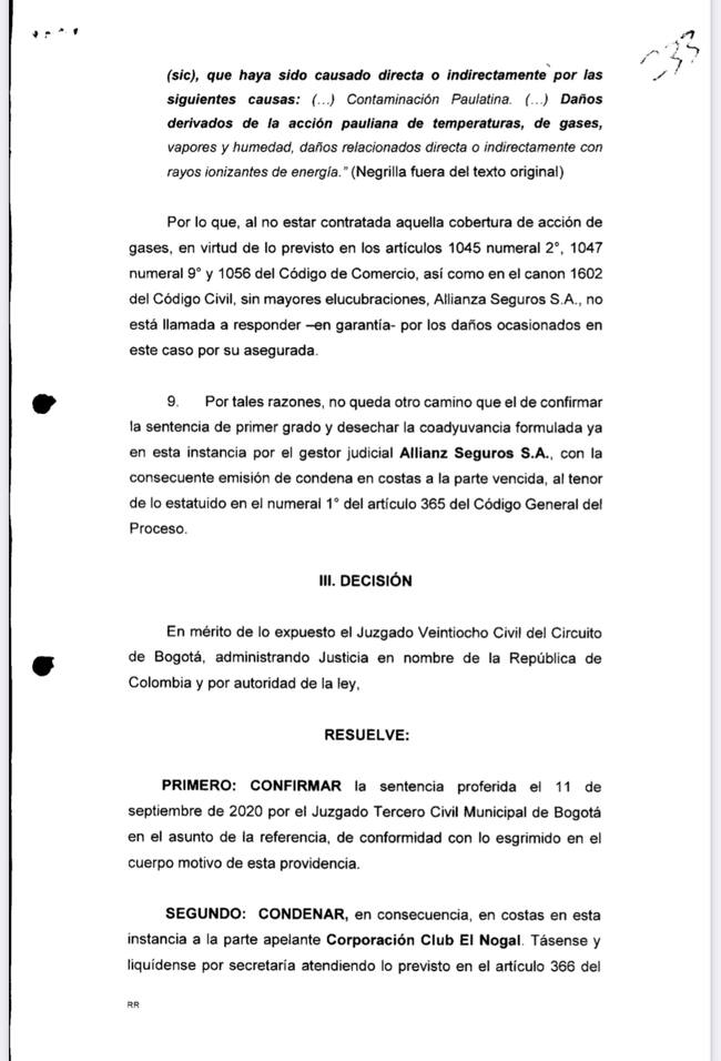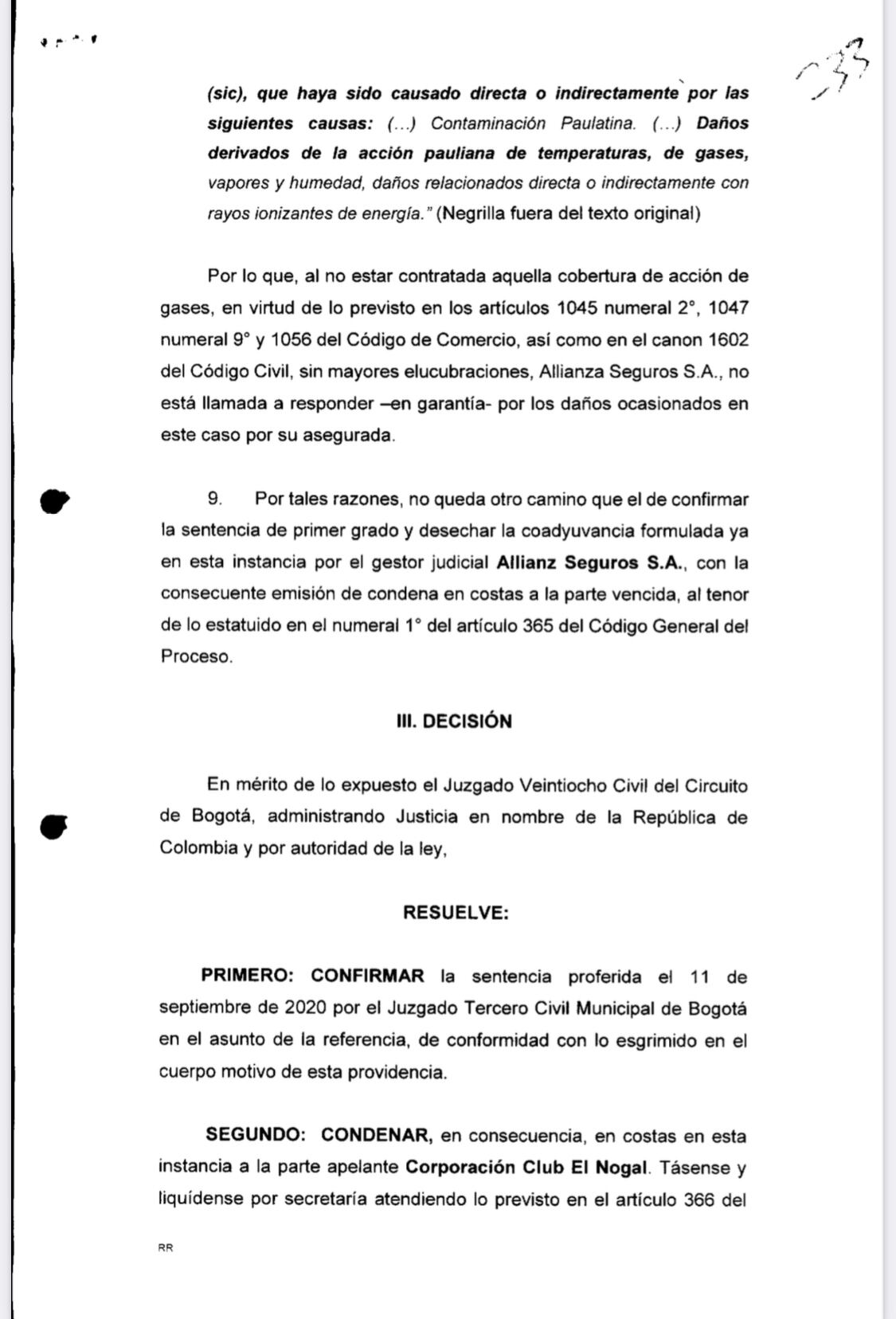 En ese sentido, confirmó la sentencia que el juzgado tercero civil municipal de Bogotá, impartió en septiembre de 2020, cuando halló civilmente responsable a la corporación club el Nogal de la muerte de ciudadano mexicano Luis Fernando Campos Yaneli, en una de las habitaciones del hotel del Club El Nogal.