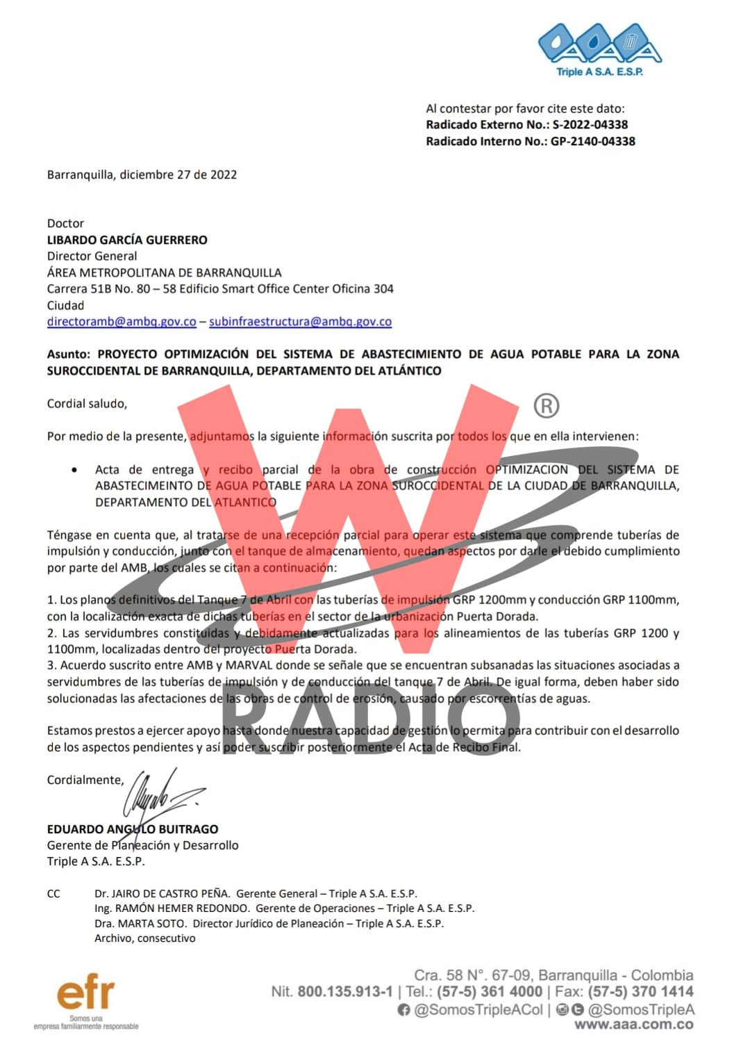 Después de 2 solicitudes realizadas a la Contraloría General de la República que fueron respondidas en las últimas semanas al medio, se conocieron los documentos enviados al ente de control por parte de la empresa Triple A y el AMB.