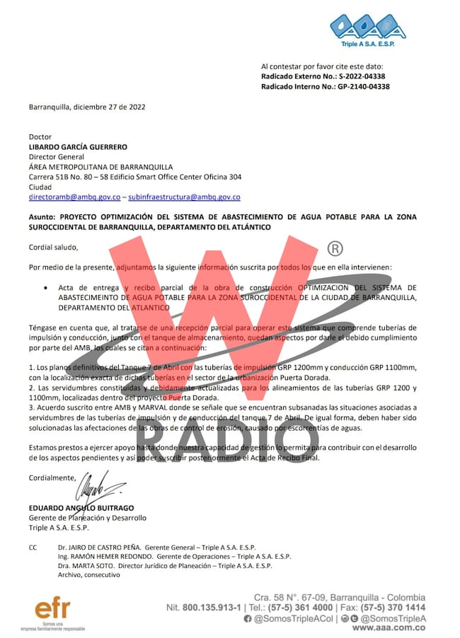 Pese al anuncio del AMB en el que aseguran que la obra se entregó completamente, en el documento enviado por la empresa Triple A al ente de control, solo hubo un acta de entrega y recibo parcial de la obra correspondiente al Megatanque 7 de abril los últimos días de 2022, debido a que la autoridad a cargo, el Área Metropolitana de Barranquilla debía cumplir con aspectos entre los que destacan los planos definitivos con localización exacta de las tuberías y servidumbres dentro de la urbanización Puerta Dorada.