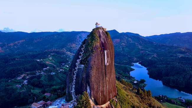 Guatapé es un municipio que se encuentra a 75 kilómetros de Medellín, y uno de sus principales atractivos es principalmente el El Peñón de Guatapé. Esta piedra es un monolito de de 220 metros de altura y cuenta con cuenta con 702 escalones hasta la cima.