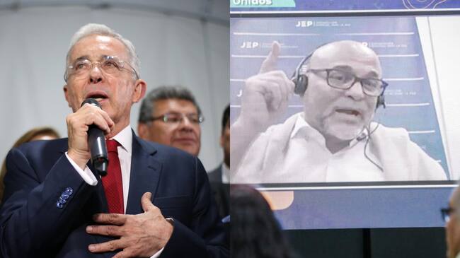 Expresidente Álvaro Uribe y exjefe paramilitar Salvatore Mancuso. Foto: Colprensa/JEP