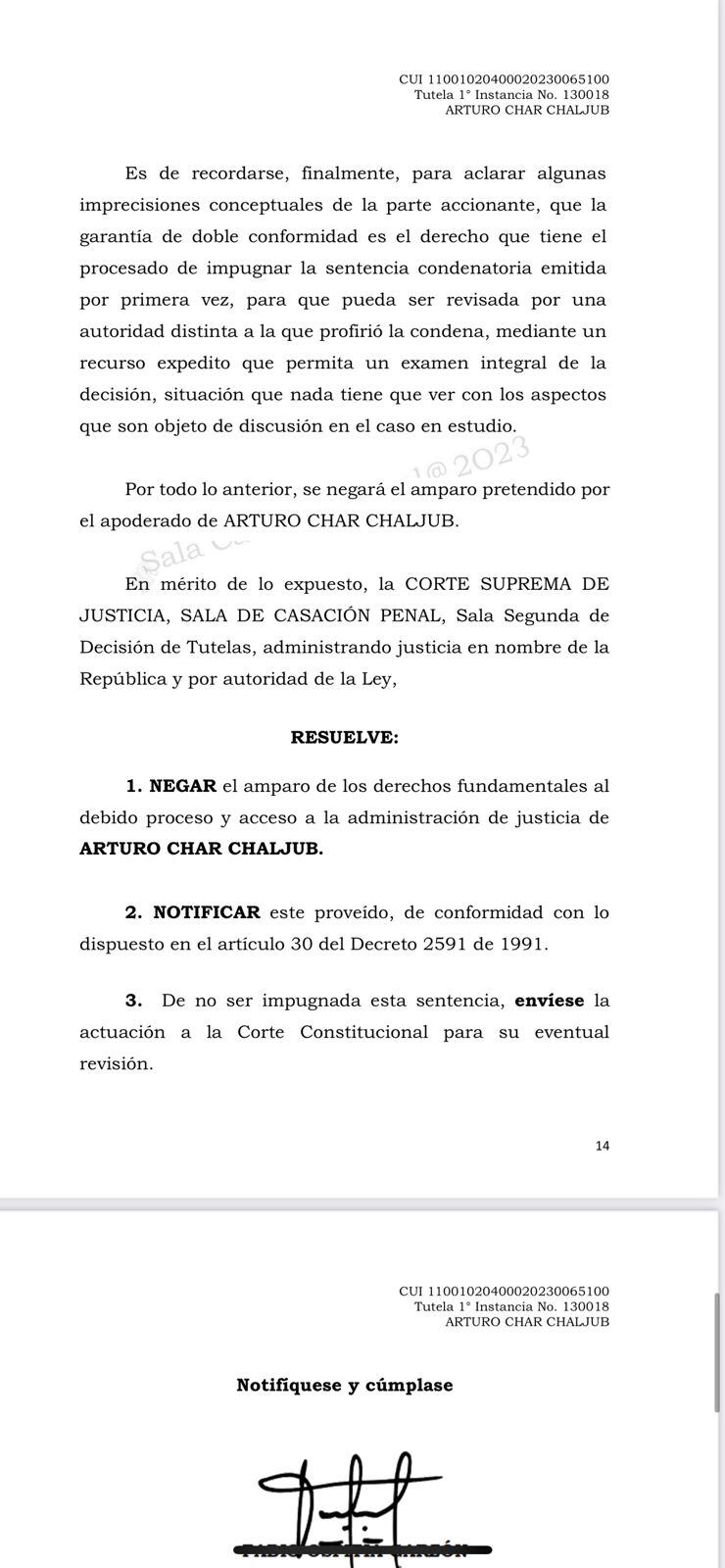 La Corte Suprema de Justicia estudió y negó una tutela presentada por la defensa del exsenador Arturo Char, con la que pretendía anular el proceso en su contra por corrupción electoral.