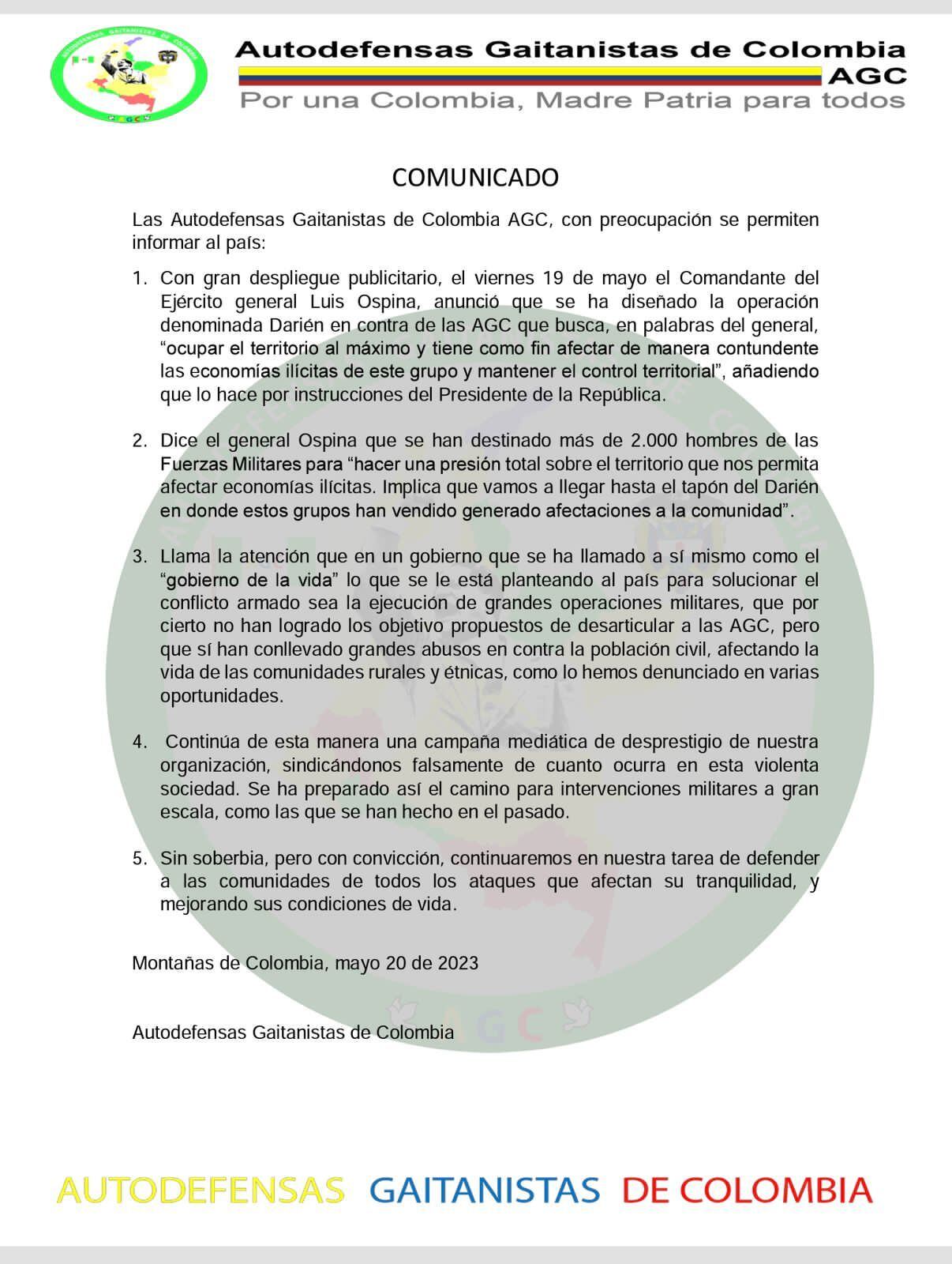 El Clan del Golfo, por su parte, dice que llama la atención que, en un gobierno que se ha llamado a sí mismo como el “gobierno de la vida”, lo que se le está planteando al país para solucionar el conflicto armado “sea la ejecución de grandes operaciones militares, que por cierto no han logrado los objetivo propuestos de desarticular a las AGC, pero que sí han conllevado grandes abusos en contra la población civil, afectando la vida de las comunidades rurales y étnicas, como lo hemos denunciado en varias oportunidades”.
