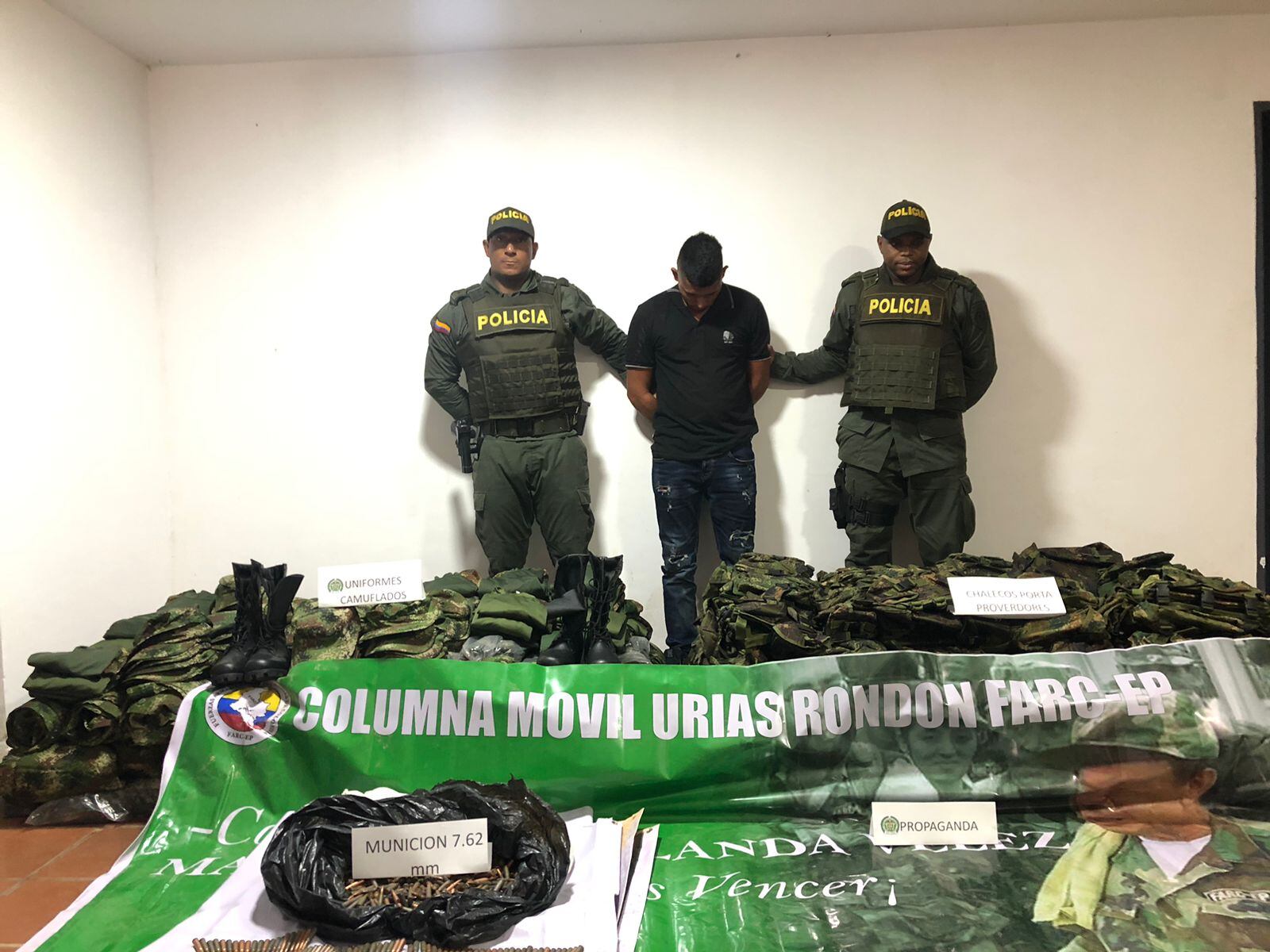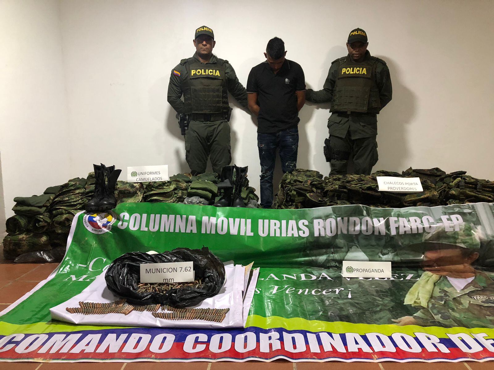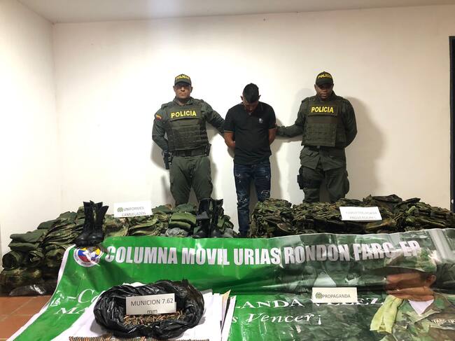 “Así mismo, al interior del automotor fueron hallados 55 pendones publicitarios y 40 libros estatutarios alusivos a Grupos al margen de la ley. Con este importante resultado las autoridades lograron la captura del conductor del vehículo por el delito de fabricación, tráfico y porte de armas, municiones de uso restringido, de uso privativo de las fuerzas armadas o explosivos y utilización ilegal de uniformes e insignias”, señala el reporte de la Policía.