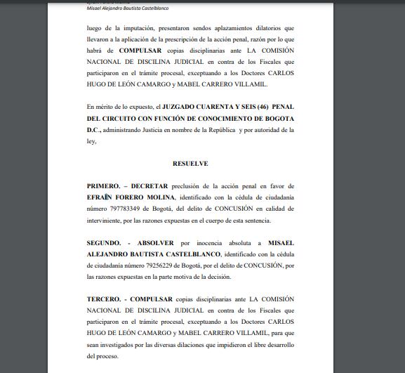 “Absolver por inocencia absoluta a Misael Alejandro Bautista Castelblanco, por el delito de concusión”, señaló el fallo.