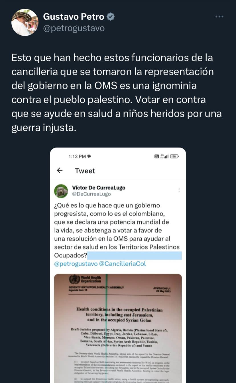 Ante esto, el presidente Gustavo Petro respondió asegurando que “esto que han hecho estos funcionarios de la Cancillería que se tomaron la representación del Gobierno en la OMS es una ignominia contra el pueblo palestino. Votar en contra que se ayude en salud a niños heridos por una guerra injusta”.