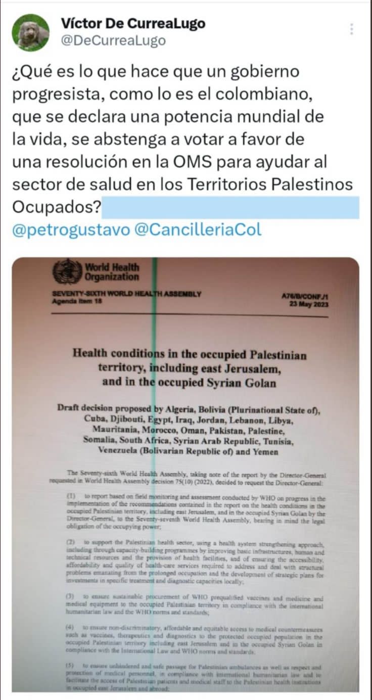 Recientemente el profesor Víctor de Currea-Lugo se refirió en su cuenta de Twitter a la decisión del Gobierno colombiano de abstenerse a votar a favor de una resolución de la Organización Mundial de la Salud para ayudar al sector salud en los Territorios Palestinos Ocupados.