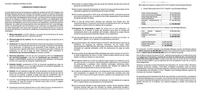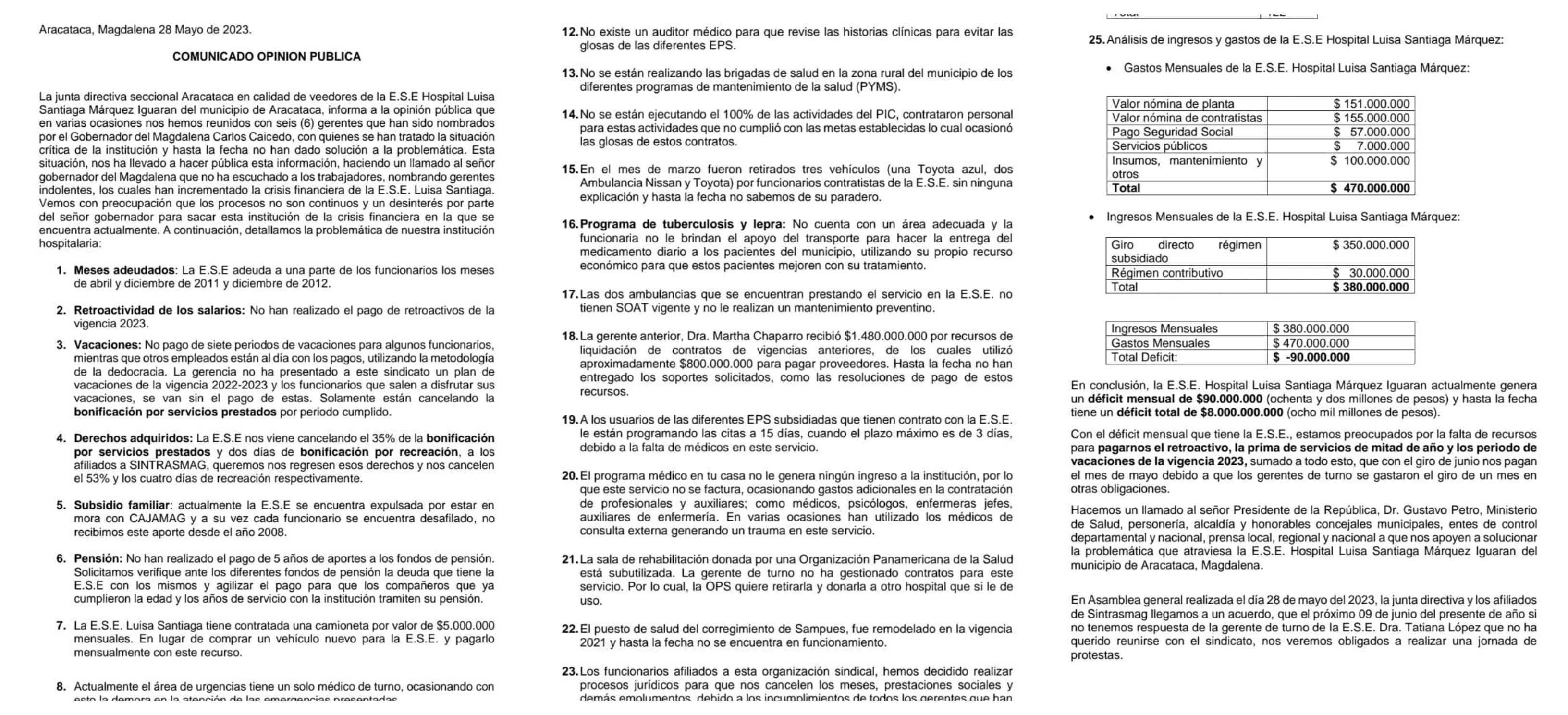 A través de un comunicado, la junta directiva del sindicato de trabajadores y empleados de la salud en el municipio de Aracataca, Magdalena, afirmó que en varias ocasiones se han reunido con seis gerentes que han sido nombrados por el gobernador del Magdalena, Carlos Caicedo, con quienes han tratado la situación crítica de la institución y hasta la fecha no han tenido solución.