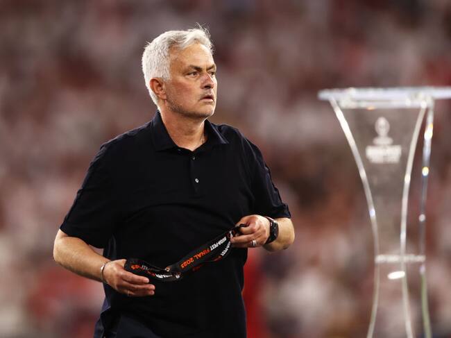 BUDAPEST, HUNGARY - MAY 31: Jose Mourinho, Head Coach of AS Roma, removes their runners up medal after collecting it from Aleksander Ceferin, President of UEFA, (not pictured) after defeat to Sevilla FC in the penalty shoot out during the UEFA Europa League 2022/23 final match between Sevilla FC and AS Roma at Puskas Arena on May 31, 2023 in Budapest, Hungary. (Photo by Naomi Baker/Getty Images) / Naomi Baker