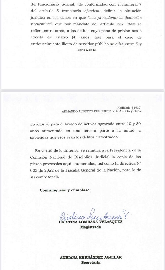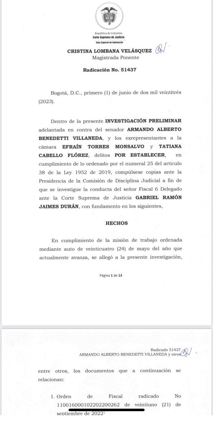 Dentro del documento de la Corte a la Comisión, la magistrada Lombana señala que le hizo seguimiento a la investigación que se adelanta contra Armando Benedetti cuando corrió traslado a la Fiscalía General de la Nación. Por esto, también pide abrirle la investigación disciplinaria a Jaimes.