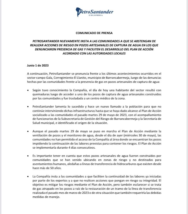 “PetroSantander lamenta lo sucedido y hace un nuevo llamado a la población para que no continúe interviniendo dichas infraestructuras hasta que se haya dado alcance al Plan de Acción socializado a las comunidades el pasado lunes 29 de mayo de 2023, con el acompañamiento de funcionarios de la Subsecretaría de Gestión del Riesgo de Barrancabermeja y la Secretaría de Salud municipal, e identificado el origen de la situación”.