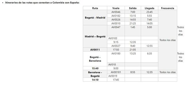 Avianca anunció que pasará de operar 42 vuelos semanales a un total de 56 vuelos a la semana en la ruta Bogotá – Madrid – Bogotá y de 14 a 28 vuelos a la semana en la ruta Bogotá – Barcelona – Bogotá, teniendo así por primera vez, una oferta de 21.000 asientos disponibles entre Colombia y España.