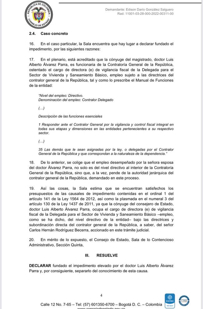 En esta petición, el abogado también adjuntó el impedimento que había presentado el magistrado Luis Alberto Álvarez en diciembre, porque su cónyuge trabaja en la Contraloría.