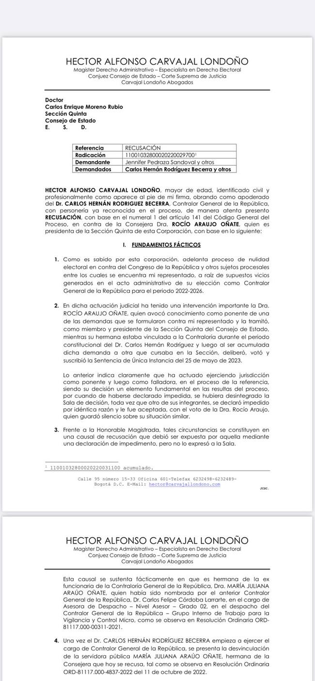 La defensa del excontralor general de la Nación, Carlos Hernán Rodríguez, presentó el 7 de junio de 2023, una recusación en contra de la magistrada de la Sección Quinta, Rocío Araujo, luego de enterarse que su hermana, la bacterióloga María Juliana Araujo, trabajaba en la Contraloría General de la Nación.