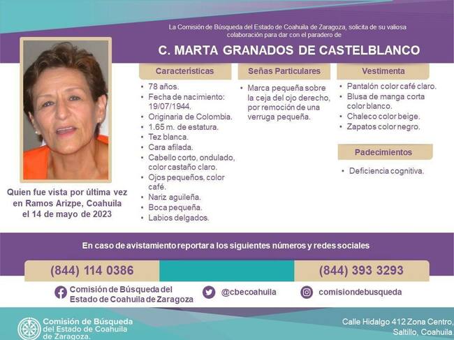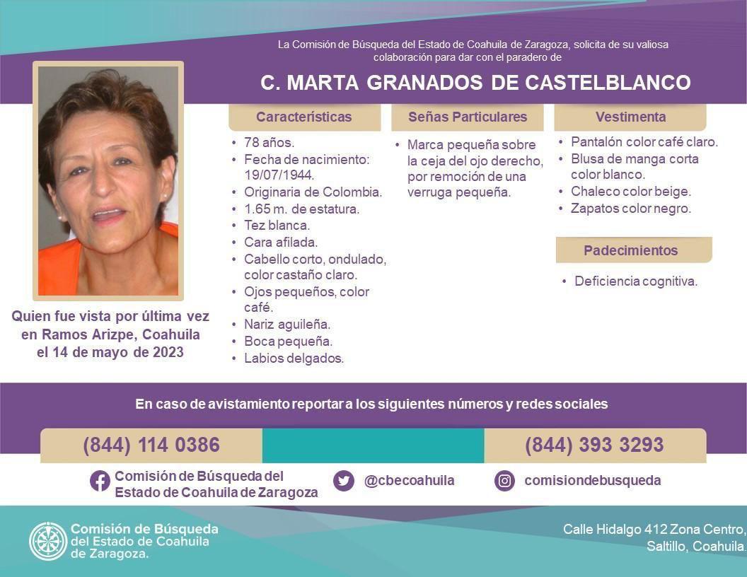 El 14 de mayo, Marta Granados de Castelblanco, de 78 años, desapareció en la zona rural de Las Rusias, en el municipio de Ramos Arizpe, estado de Coahuila (México). Nadie la ha visto, nadie sabe nada...